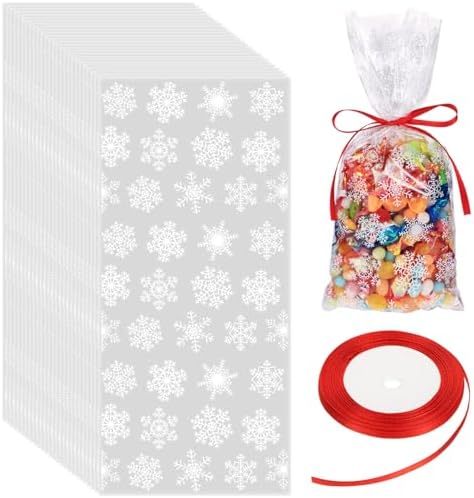 View full detailsBoao 100 Pcs Christmas Cellophane Treat Bags Snowflake Goodie Candy Bag with Ribbon for Winter Holiday Christmas Party Supplies(White Bag with Red Ribbon)