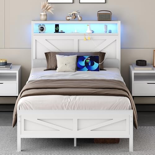 View full detailsQueen Bed Frame with Headboard, Queen Bed Frames with Outlets and LED Lights, Rustic Bed Frame with Storage Headboard, Farmhouse Barn Door Design, Noise Free, No Box Spring Needed, White