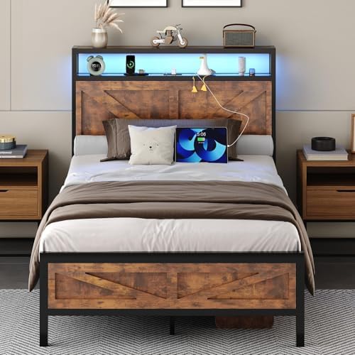 View full detailsTwin Bed Frames with Charging Station and LED Lights, Twin Size Metal Platform Bed Frame with Storage and Rustic Barn Door Headboard, Heavy Duty Steel Slats Support, No Box Spring Needed, Rustic Brown