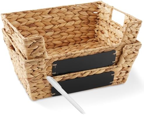 View full detailsCasafield Set of 2 Water Hyacinth Pantry Baskets with Handles, Chalkboard Labels, and Marker - Natural, Wide Woven Storage Bin Organizers for Kitchen Shelves