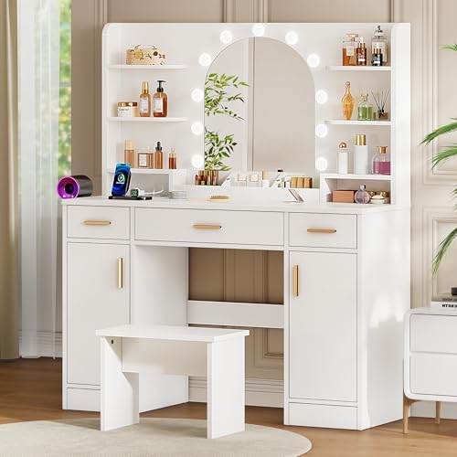 View full detailsVanity Desk with Mirror and 11 LED Lights, 43'' Makeup Vanity Table with Power Outlet & Chair, Dressing Table with 3 Drawers, 2 Cabinets and 6 Open Shelfs for Bedroom, White