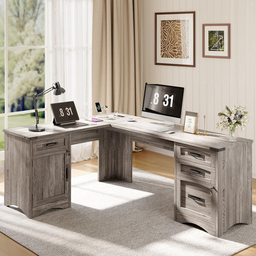 View full detailsL Shaped Farmhouse Executive Desk with Drawers, 67" Home Office Desks with Fast Charging Station, Lockable File Cabinet, Wood Writing Computer Desk for Work, Study, Grey