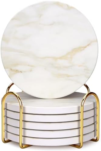 View full detailsWhite Marble Style Ceramic Coasters Set of 6 with Holder Modern Coffee Table Decor Drink Coaster Gifts Absorbent Stone Coasters for Rustic Farmhouse Bar