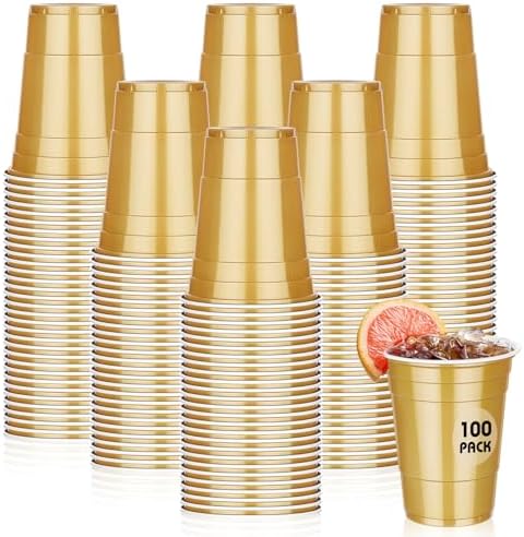 View full detailsDualshine 100 Pack 16 oz Gold Plastic Cups, Disposable Plastic Party Cups, Heavy Duty Drinking Water Cup for Wedding Birthday Graduation Valentine's Day Christmas Baby Shower Picnic Barbecues Supplies