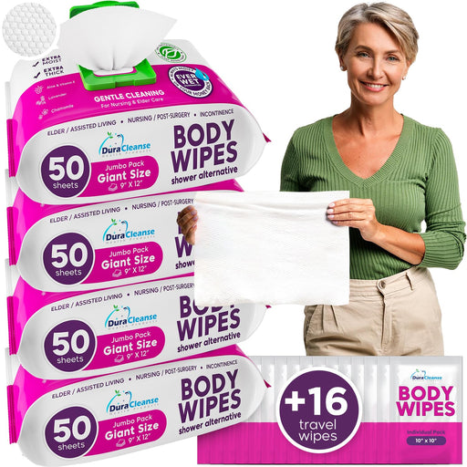 View full detailsXL Body Wash Wipes for Adults Bathing No Rinse & Elderly Incontinence (4pk) - 200 Ct. + 16 Travel Bath Wipes - 9"x12" Disposable Washcloths for Adult Surgery Recovery Supplies & Elder Care Products