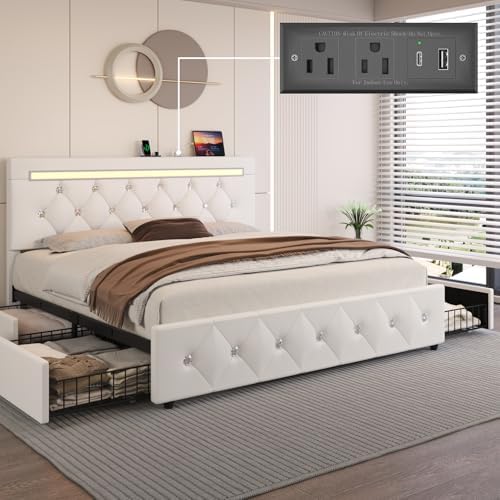 View full detailsQueen Size Bed Frame with 4 Storage Drawers and LED Lights, Upholstered Platform Bed with Adjustable Headboard and Charging Station, Metal Slats Support, No Box Spring Needed,Easy Assembly, White