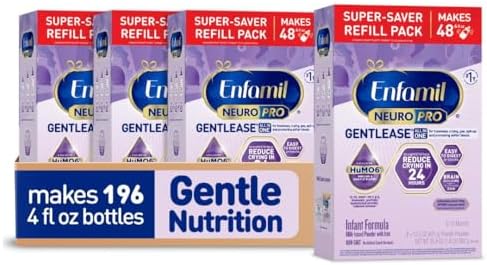View full detailsEnfamil NeuroPro Gentlease Baby Formula, Infant Formula Nutrition, Brain Support that has DHA, HuMO6 Immune Blend, Designed to Reduce Fussiness, Crying, Gas & Spit-up in 24 Hrs, has Prebiotics to Promote Softer Stools, 27.4 Oz, 4 Cans