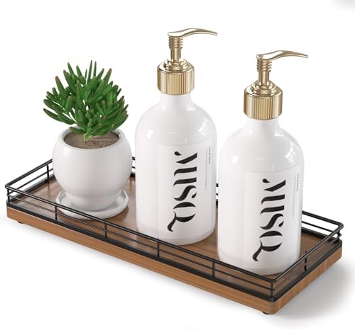 View full detailsBathroom Tray for Counter, Oak Wooden 11.2" L Decorative Vanity Tray for Dresser Tops Perfume Jewelry Makeup Candle Soap Sponge Holder for Kitchen Countertop Organizer Coffee Table Decor Bar Black