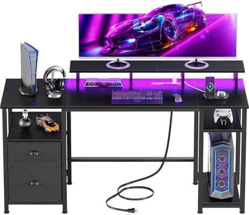 View full detailsFurologee 61" Gaming Desk with Power Outlets & LED Lights, Reversible Computer Desk with File Cabinet & Monitor Stand for Home Office, Large Work Table with Storage Shelves & Drawer, Black