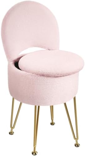 View full detailsGREENSTELL Vanity Stool Chair with Storage and Folding Back, 15.7" x 15.7" x 19.5" Faux Fur Soft Ottoman for Adults, 4 Metal Legs with Anti-Slip Feet, Furry Padded Seat for Makeup, Bedroom, Pink
