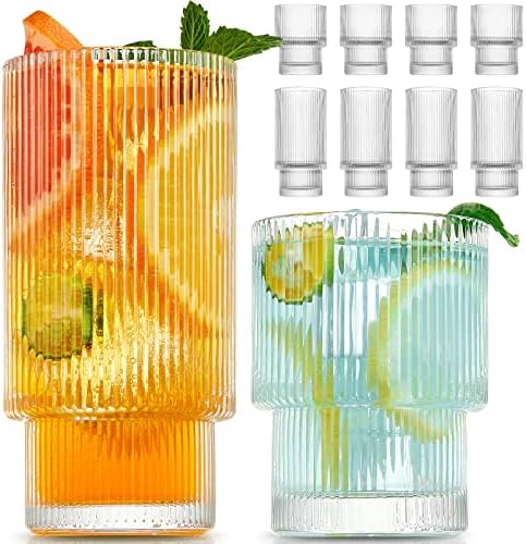 View full detailsSmall 8 Pack Drinking Glasses, 4pcs Highball Glasses (11oz) & 4pcs Rocks Glasses (6oz), Vintage Glass Cups, Elegant Ribbed Glassware, Iced Coffee Glasses, Glass Tumbler for Cocktail, Whiskey, Juice
