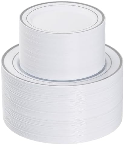 View full detailsGoodluck 200PCS Silver Plastic Plates, Heavy Duty Disposable Gold Plates with 100 10.25 inch Dinner Plates and 100 7.5 inch Dessert Plates, Disposable Plates for Party, Holiday, Wedding, Christmas