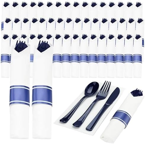 View full detailsGoodluck 50 Set Dark Blue Pre Rolled Plastic Cutlery Set, Wrapped Silverware Set with 50 Forks, 50 Knives, 50 Spoons and 50 Napkins, Perfect for Party, Wedding, Christmas