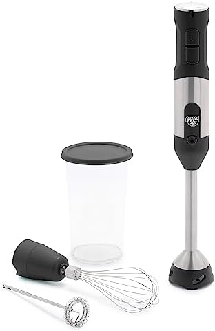 View full detailsGreenLife 500-Watt Immersion Electric Handheld Stick Blender with Stainless Steel Blades, Whisk, Frother, Measuring Cup and Lid, Soups, Puree, Cake, Multi-Speed Control, Portable, Black