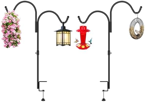 Gtongoko 35 Inch 2 Pack Double Deck Hook for Railing, Deck Bird Feeder Pole with 3 Inch Strengthened Clamp for Hanging Bird Feeders, Lanterns, Wind Chimes, Flower and Plant Baskets