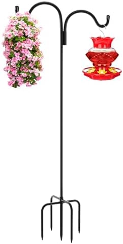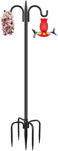 Gtongoko Double Shepherds Hook for Outdoor, 92 Inch Bird Feeder Pole with 5 Prongs Base, 5/8 Inch Thick Heavy Duty Adjustable Garden Hook for Hanging Plant, Lantern, Hummingbird Feeder, 1 Pack