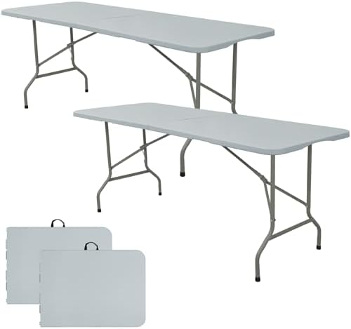 View full detailsSet of 2 Folding Table 6 FT Lightweight Camping Table Portable Plastic Rectangular Outdoor Dining Table Steel Legs Fold-in-Half with Carrying Handle for Indoor,Picnic,Party,Wedding,Events(Grey)