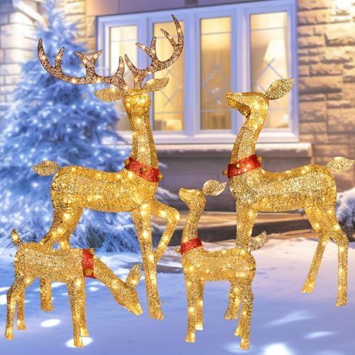 View full detailsHOYECHI Christmas Decorations Outdoor Reindeer Family - 4-Piece 3D Lighted Deer Set with 245 LED Lights, Yard Christmas Decor with Stakes for Front Yard, Lawn, Garden, Porch, Holiday - Gold