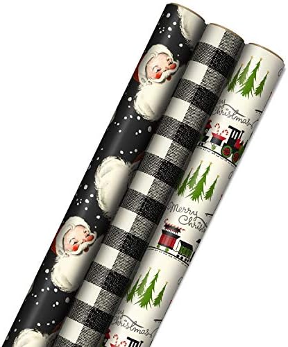 View full detailsHallmark Black Christmas Wrapping Paper with Cut Lines on Reverse (3 Rolls: 120 sq. ft. ttl) Retro Santa, Black and White Buffalo Plaid, Train and Trees (0005JXW1077)