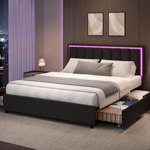 View full detailsQueen Size Bed Frame with 4 Storage Drawers, Upholstered Bed Frame with Headboard, RGB LED Ligths, Heavy Duty Metal Frame and Wood Slat Support, No Box Spring Needed, Easy Assembly, Black