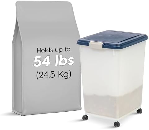 View full detailsIRIS USA Airtight Pet Food Storage Container, Up to 54 lbs, Attachable Wheels, For Dog Cat Bird and Other Pet Food Storage Bin, Keep Fresh, Easy Mobility, BPA Free, Navy/Pearl