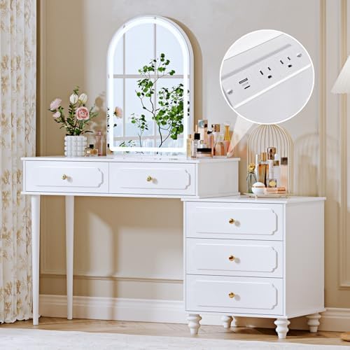 View full detailsWhite,Vanity Desk with Mirror and Lights,Makeup Vanity with Power Outlet and Adjustable Cabinet,Modern Makeup Table with 3 Drawers for Bedroom Makeup Room