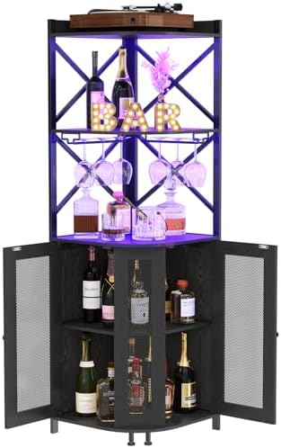 View full detailsJKsmart Corner Bar Cabinet with LED Lights, 5-Tier Industrial Wine Bar Cabinet with Glass Holder, Farmhouse Liquor Cabinets with Shelf and Door, Home Bar for Coffee Bars, Black