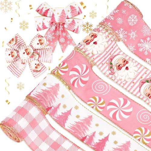 View full details5 Roll Pink Christmas Wired Edge Ribbon 2.5 Inch 30 Yards Santa Xmas Tree Snowflake Plaid Ribbon for Bow Wreath Craft Gift Wrap Party Decor