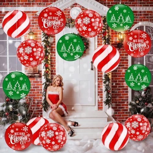 12 Pcs 24/16 Inch Giant PVC Christmas Inflatable Ball Outdoor Blow up Xmas Inflatables Ornaments Giant PVC Christmas Ornaments for Tree Yards Lawns Porch Garden Front Doors Holiday Decor(24 Inch)