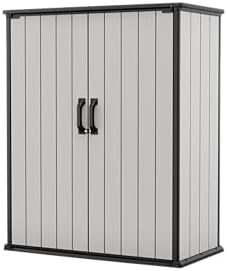 View full detailsKeter Premier Tall 4.6 x 5.6 ft. Resin Outdoor Storage Shed with Shelving Brackets for Patio Furniture, Pool Accessories, and Bikes, Grey & Black