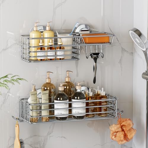 LEVERLOC Shower Caddy Suction Cup, 2 Pack Heavy Duty Bathroom Organizer for Inside Shower with Hooks & Soap holder, Removable and Rustproof Silver bathroom Holder Storage