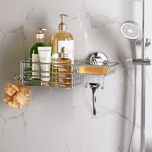 LEVERLOC Shower Caddy Suction Cup, Shelves for Inside with Hooks & Soap Holder Toothbrush Holder, NO-Drilling Bathroom Organizer, Rustproof Holder Storage, Silver