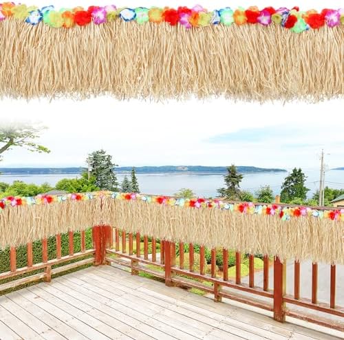 View full detailsLyrow Natural Hawaiian Luau Grass Raffia Fringe Banner 143 x 11.8 Inch Hawaiian Grass Table Skirt Tiki Bar Decoration for Tropical Deck Skirting Tent Chair Summer Birthday Party