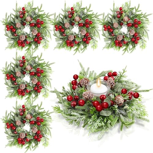 View full detailsLyrow 8 Pcs Christmas Candle Rings Wreath Norfolk Pine Garland Red Berry Pinecones Wreaths Artificial Berries Snowy Pine Garland Candle Ring Holder for Christmas Wedding Home Table Centerpiece