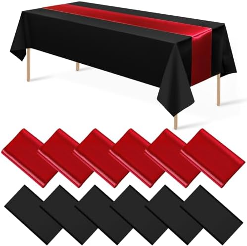 What you will get: the package includes 6 pcs black rectangle plastic tablecloth and 6 pcs red satin table runner, specific color as the picture...