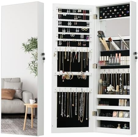 View full detailsFull Length Mirror Jewelry Cabinet - 2-in-1 Organizer for Makeup and Jewelry,Lockable Door Wall-Mounted Jewelry Armoire with Shelves and Behind the Door Storage White