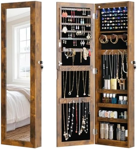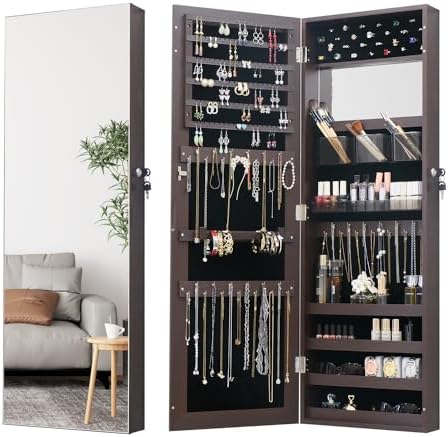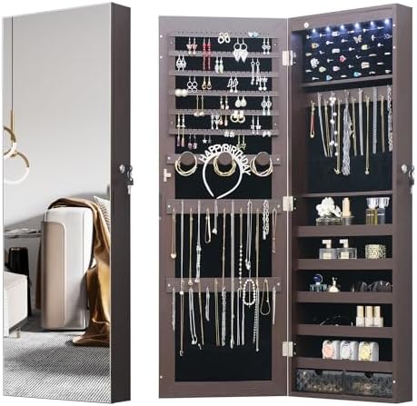 View full detailsLED Jewelry Cabinet Armoire Organizer,Wall/Door Mount Jewelry Organizer and Storage with Full-Length Mirror Hanging Jewelry Organizer Full Length Mirror with Storage Large Capacity Brown