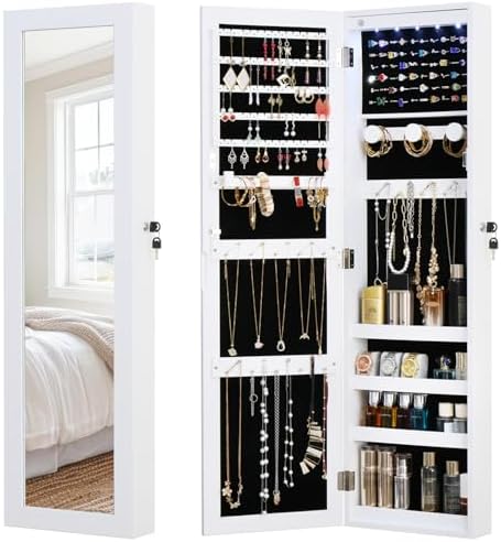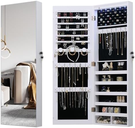 View full detailsLED Jewelry Cabinet Armoire Organizer,Wall/Door Mount Jewelry Organizer and Storage with Full-Length Mirror Hanging Jewelry Organizer Full Length Mirror with Storage Large Capacity White
