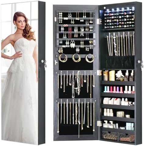 View full detailsLED Jewelry Cabinet Armoire Organizer,Wall/Door Mount Jewelry Organizer and Storage with Full-Length Mirror Hanging Jewelry Organizer Full Length Mirror with Storage Large Capacity