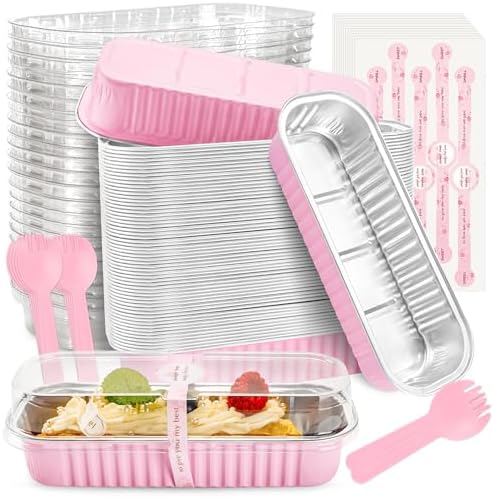Mini Loaf Pans with Lids and Spoons Rectangular Aluminum Foil Baking Pans Mini Cheesecake Containers 6.8oz(60 Pack, Pink)