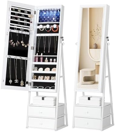 View full detailsNicetree LED Jewelry Cabinet Armoire with 2 Drawers, Lockable Standing Mirror Jewelry Cabinet, Full Length Mirror with Jewelry Storage, Christmas Gifts, White