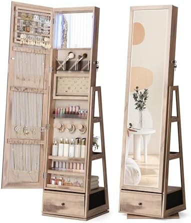 View full detailsNicetree 360° Rotating Jewelry Cabinet with Lights, Full-Length Mirror Jewelry Armoire Organizer with Touch Screen Vanity Mirror, Storage Drawers & Shelves for Necklaces, Earrings, Rustic Brown