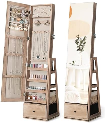 View full detailsNicetree 360°Swivel Jewelry Cabinet, Rotatable Full Length Mirror with Jewelry Storage, Standing Jewelry Armoire Organizer, Lockable Jewelry Organizer with 3 Rear Shelves, Bottom Drawer, Toasted Oak
