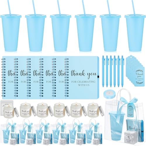 View full detailsNuogo 6 Sets Baby Shower Prizes for Player Winners Adults Include Plastic Tumbler Notebook Scented Candles Ballpoint Pen Gift Bag, Baby Shower Player Winner Gifts Bridal Game Gifts(Blue)