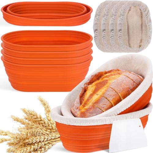 View full detailsNuogo 4 Pack Oval Bread Proofing Basket Silicone 10 Inch Collapsible Sourdough Bread Baking Supplies Dough Proofing Bowl with 4 Pcs Dough Scraper and 4 Pcs Basket Covers(Orange)