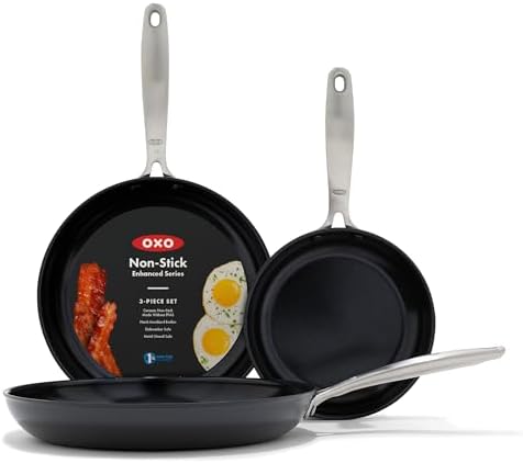 View full detailsOXO Enhanced, 8" 10" and 12" 3 Piece Frying Pan Skillet Set, Healthy Ceramic Nonstick, PFAS-Free, Stainless Steel Handle, Dishwasher Safe, Oven Safe, Black