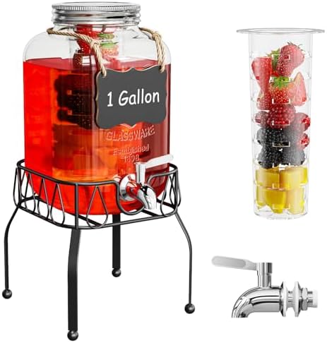 View full detailsOneDream Glass Drink Dispenser for Parties, 1Gallon Beverage Dispenserd with Stand, Lemonade Dispenser with Stainless Steel Spigot and Fruit Infuser, Come with Ice Cylinder, Used as Sun Tea, Juice
