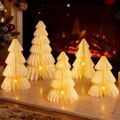View full detailsChristmas Table Decorations Indoor, 5 Pcs Large White Honeycomb Paper Christmas Trees, Vintage Light Up Table Centerpieces for Xmas Winter Wonderland Holiday Party Weddings Home Decor, 12/14/16 Inch