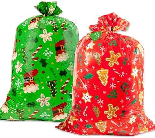 View full detailsOuMuaMua 2pcs Large Christmas Gift Bags, Jumbo Holiday Drawstring Gift Bags 36" x 49" Giant Plastic Reusable Present Wrap Bags with Cards for Big Xmas Presents Party Decorations Holiday Gift Giving