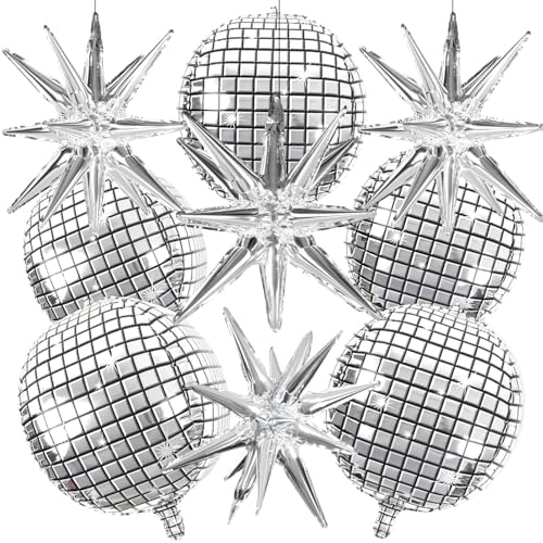 View full detailsOuMuaMua Disco Ball Balloons for 70s Disco Party Decor, 22 Inch Large 4D Metallic Silver Disco Balloons with Stars Balloon for Themed Party, Birthday New Year Christmas Decor 9pcs